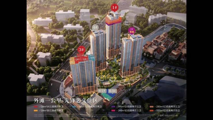 户型:建面约124-330㎡3-5房,备案均价约14.85万/㎡,总价约1545万起