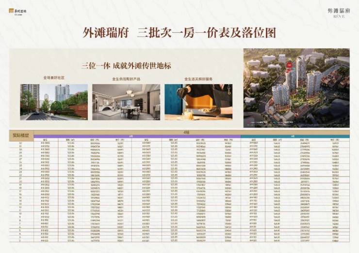 产品:4栋24-32层高层+1栋风貌保护建筑,容积率3.87、绿化率35%,共320-468户,精装交付