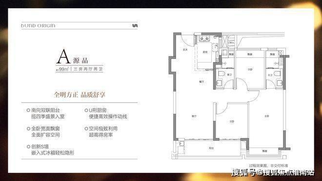 建面约99㎡3房2厅2卫,非常标准的动静分离、三开间朝南户型。"分户s墙"设计在分户墙处增设“凹型空间",“冰箱外移"增加厨房操作台面和收纳空间,创造更合理的餐厨桌台动线。三开间朝南+南向双阳台设计+全卧室带飘窗,为整个户型带去非常出色的采光,同时室内视野的延展性很强。动静分离则是把功能区与休息区分割,加上主卧套房的设计,让业主有更好的私密性和生活舒适度。
