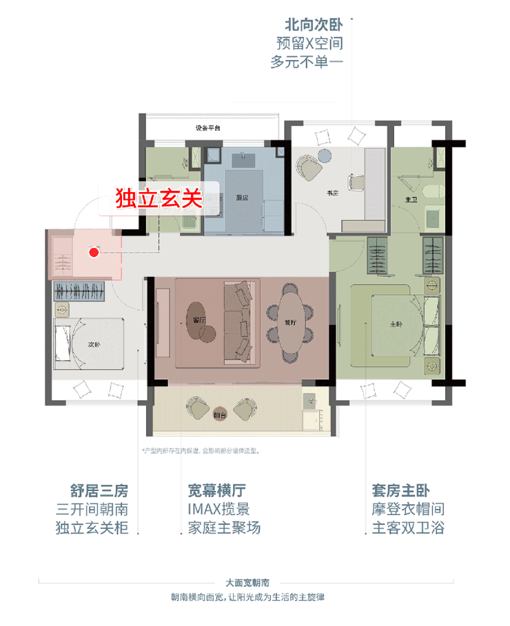 北向设置X空间,可随家庭人口自行调整,可以是卧室,也可以是书房、画室、女王化妆间等。