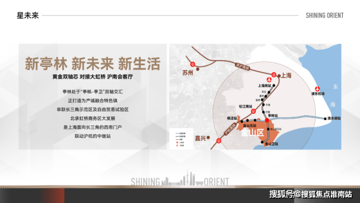 双轨加持——距离金山铁路亭林站约2.5km,5站到上海南站,轨交南枫线(规划)串联上海南部客流主动脉