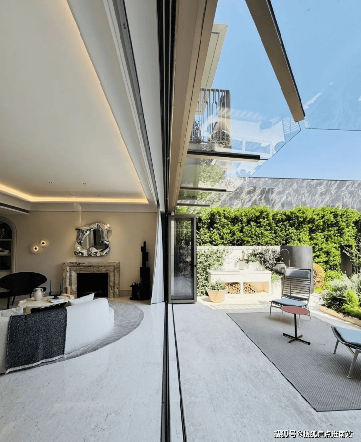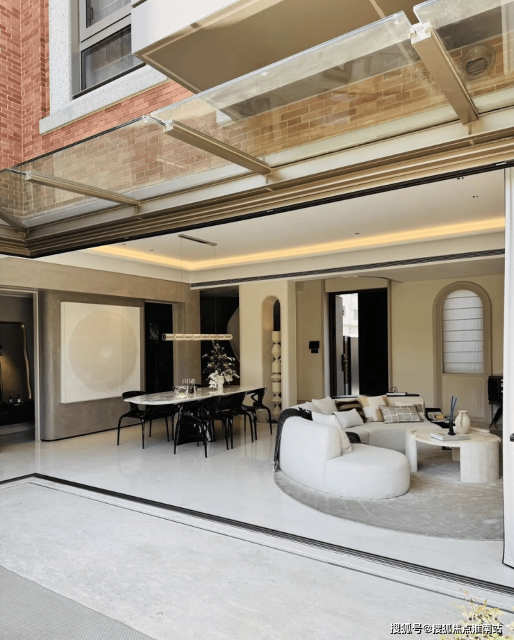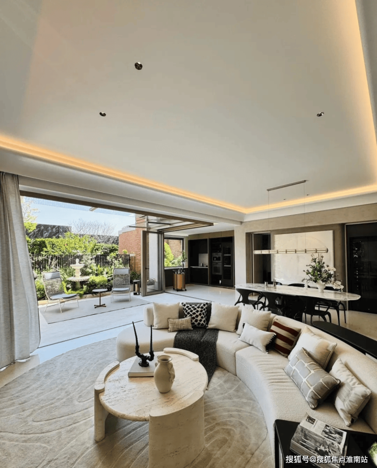 「无界空间」:客厅270度转角无柱设计,搭配落地玻璃,开阔视野将院中风景迎入日常。