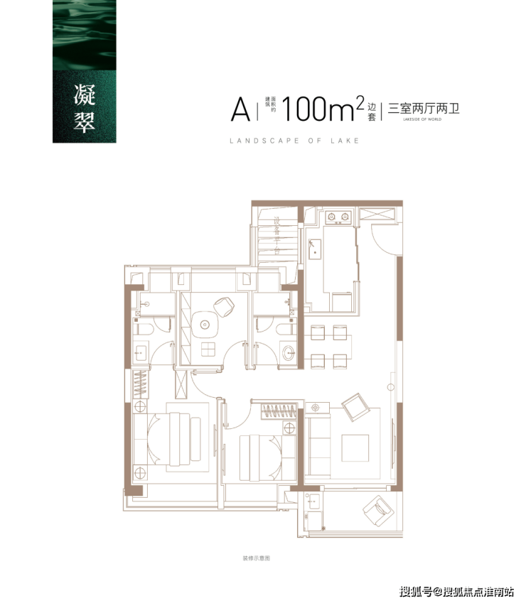 建面约100㎡3房2厅2卫,做到了三开间朝南+主卧套房设计+动静分离+全卧室带飘窗,功能性和尺度感完美结合的3房户型。