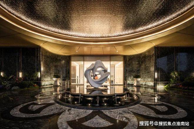 最具仪式感的应该是大门入口处:宽约35米、高约6.5米的寰宇云厅,如殿堂一般气势恢宏,两侧还有挪威蓝翡翠石材景墙对仗而立。