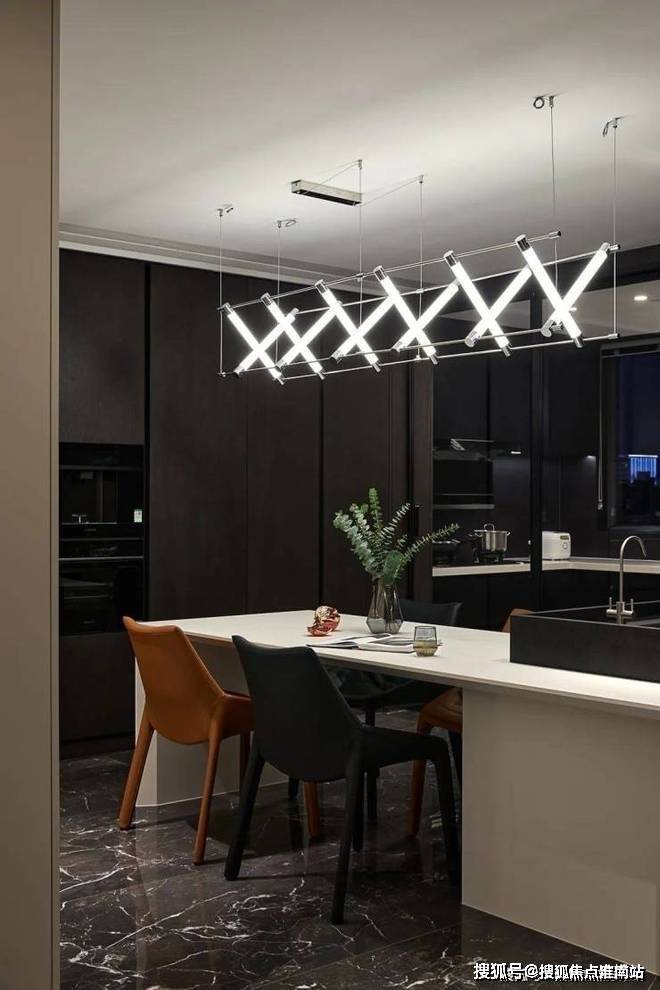 与客厅相比,餐厅对黑色的运用更为多元.设计师巧妙地运用不同材质,吊灯与精致器皿相得益彰,一幅城市墨画定格了时间,伴随着富有格调的三餐四季.