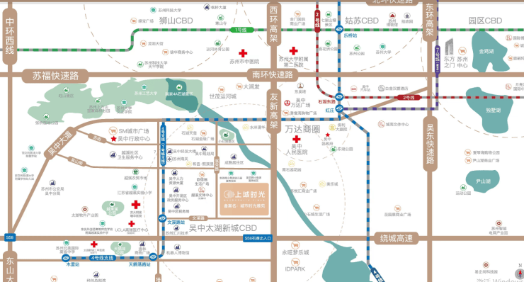 自驾出行:紧邻西环高架、吴中大道快速路,出门直线距离约200米可上友新高架,快速连接苏州核心区域;自驾15min可达姑苏主城、狮山核心区,25min到金鸡湖,融入长三角一小时通勤圈。