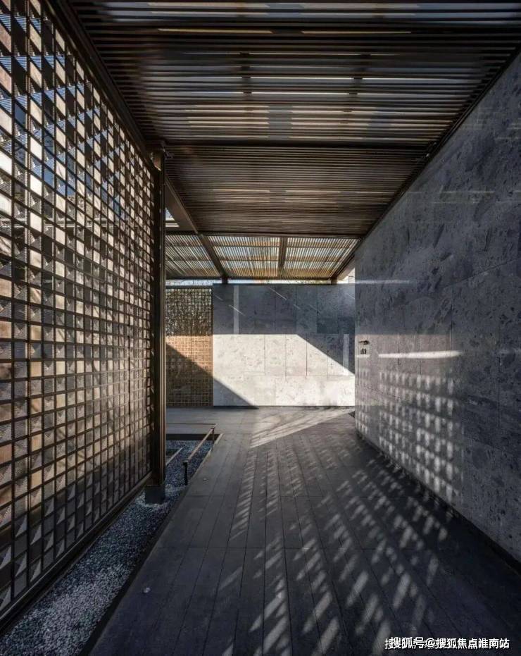 厅堂和轩堂,也在这番赏景过程中,毫不突兀地依次出现。前者还原出孔子树下讲学的场景,后者则用金属编织的卷帘搭配青绿色彩釉玻璃,构建出一个品茗厅琴的空间。这一切来得如此自然、连贯,富有节奏和层次,把园林艺术的本质抓得入木三分。
