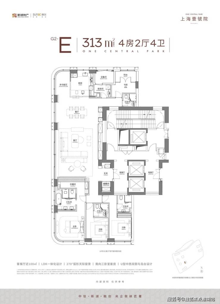 此外,全系采用两梯两户设计,电梯为对开门,电梯厅空间完全私享!在户型设计上,其最大约15m南向三面宽、5大弧形全景舱、中西厨设计等,通过通透格局与开阔视角,将私密性与全景视觉体验完美结合,以创新形态重塑高端住宅的空间美学标杆!在豪宅产品力打造这件事上,上海壹号院可谓是不断突破创新;