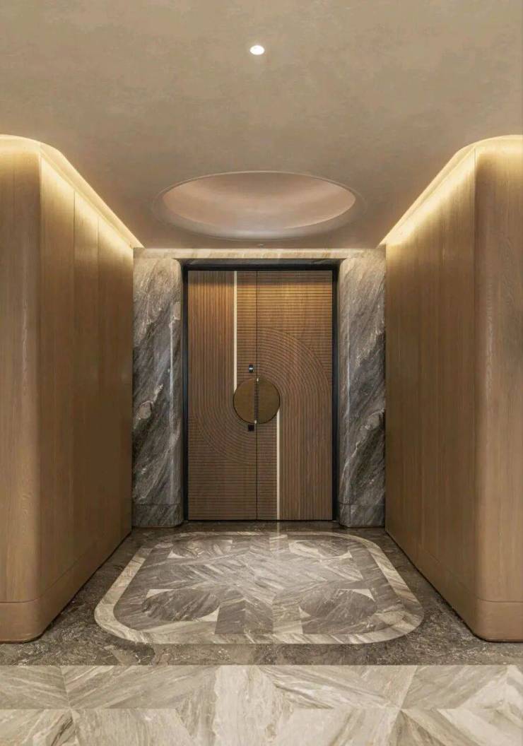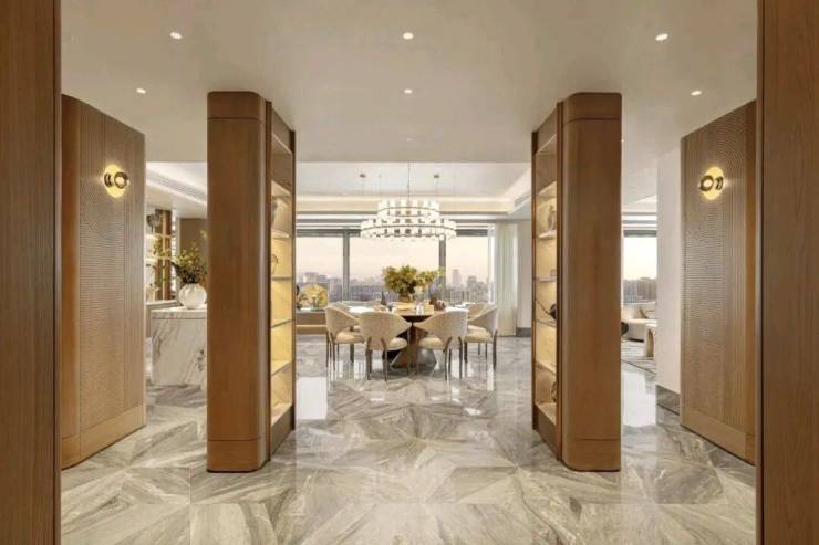 进入室内的入户玄关收纳空间,地面采用静雅棕、宝格丽兰石材拼花设计,古典回形波打+实心铜条的搭配增强入户尊贵感。右侧是山水白奢石的开放格,左侧是行李间,通过暗门的做法,将功能结合进去,强化了归家的仪式感。