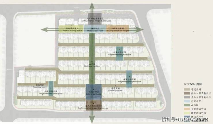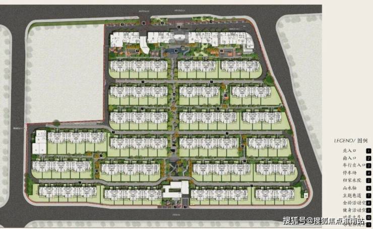 在园区规划和品质提升方面,注重高端社区的隐奢感和礼仪感,营造大宅的空间序列格局。空间轴线是建筑层次构建与韵律感的重要组成部分,本案在局促的场地条件下,通过合理高效的内部功能组织,采用多种虚实体块穿插和组合的方式,塑造贯穿南北的一条180余米主轴线。