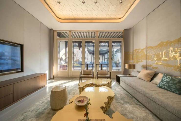 外立面采用传统灰瓦白墙+木雕窗棂,复刻宋代江南建筑美学