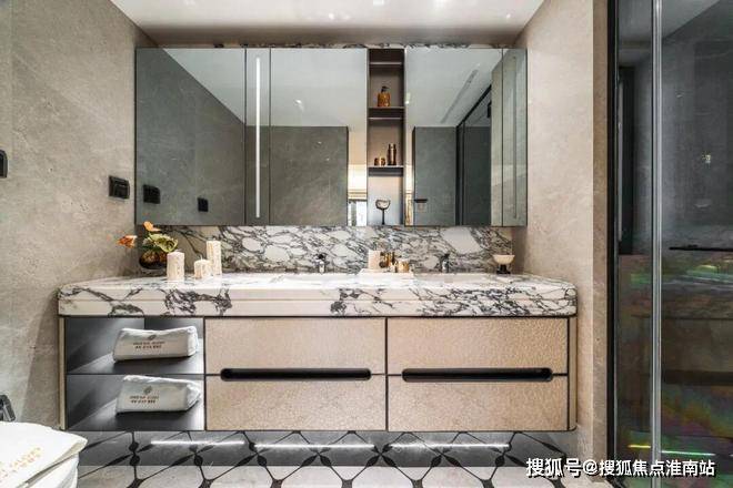主卫采用意大利“大花白”天然石材实现地墙满铺,双台盆与双镜柜的对称设计复刻五星酒店规制,美妆冰箱精准控温呵护护肤品,搭配劳芬智能一体马桶、当代五金花洒,这样的王炸组合以往只会在200㎡+ 豪宅里出现。次卫延续品质标准,干湿分离设计加上高仪龙头和唯宝智能马桶盖,每处细节皆为高端居住量身打造。