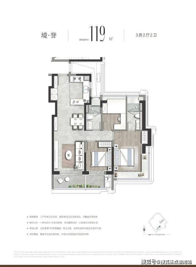 洄游式270°采光大横厅亮点满满,北向飘窗可升级为全落地窗,搭配东面270° 景观阳台,形成环幕通透格局,将苏州河景与社区绿意尽收眼底,这一“端厅式设计”在约143㎡面积段实属罕见;三卧室朝南的“平权采光”设计,则精准匹配了二胎或三代同堂家庭需求。