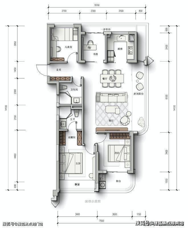 三房两厅两卫设计,三开间朝南,南向开间将近10米,客厅还连通了进深约1.5米的大阳台。