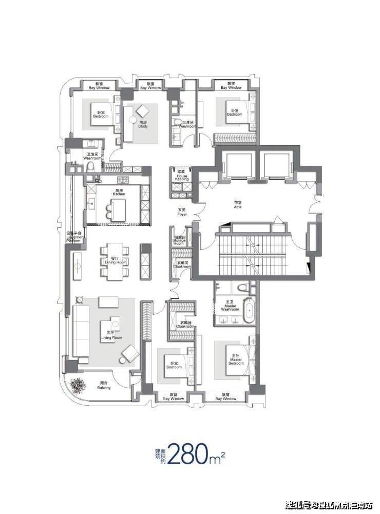 280㎡4+X房:内环内·大师定制艺术·全功能性奢宅;边套270度舒适采光,超大舒适厨房,五房空间尺度、可根据自身需求调整功能;3700-4000万,尊崇功能五房,满足现有市场多孩客户需求,可随时更改室内功能性;客阳台一体,边套270°舒适采光;