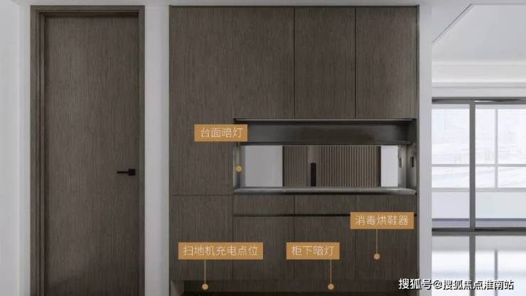 台面暗灯、柜下暗灯、入户感应、一键断电、消毒烘鞋器、扫地机充电点位6大设计,让居者出行更方便。