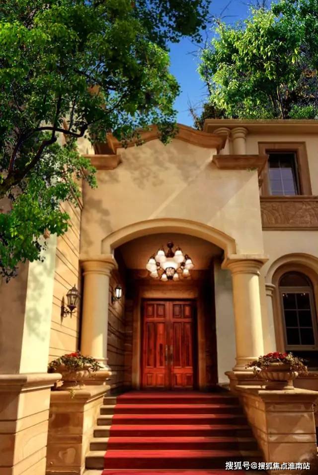 再看入户大门,1.8米双开门,高门大户,与文艺复兴时期梁柱、拱圈搭配,庄严对称。六级台阶拾阶而上,象征家庭顺利和谐,事业蒸蒸日上。