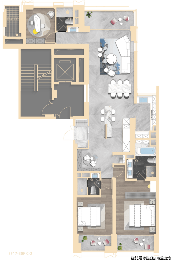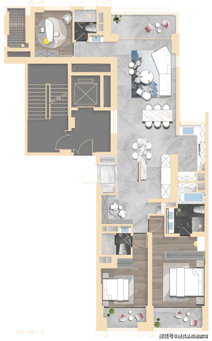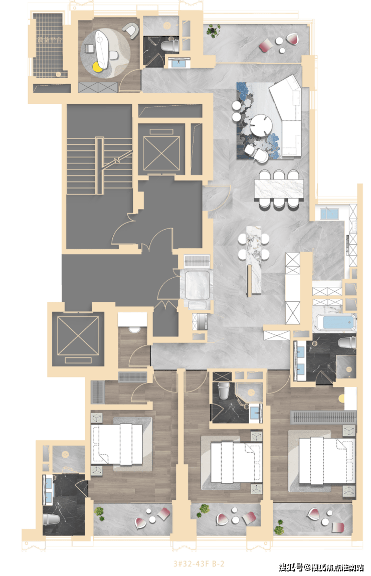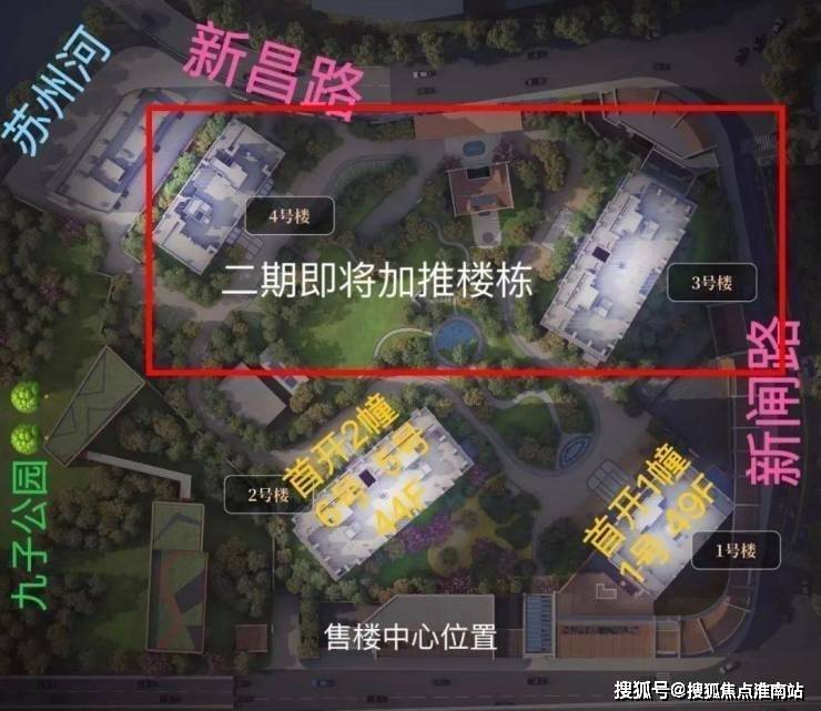 其中3#为超高层,北向可观小区绿化和苏河景观,高区可瞰三件套盛景。