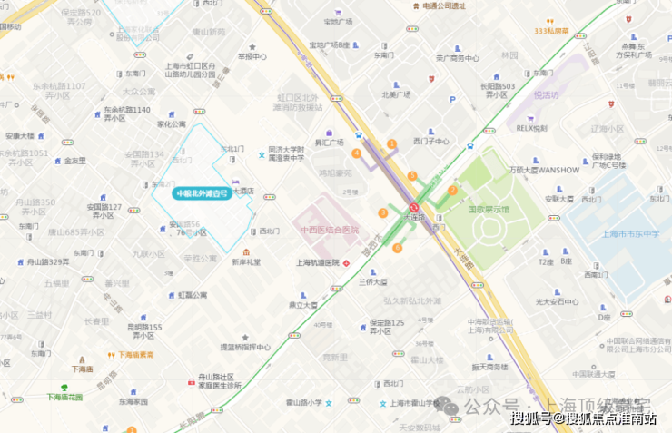 另外,地块距离黄浦江直线距离仅约几百米,步行可达北外滩滨江绿地公园,与陆家嘴隔江相望;除此之外,东面约1.2km是上海江浦公园,北面约1.5km是占地264亩的上海和平公园,坐拥上海市中心难能可贵的生态资源。