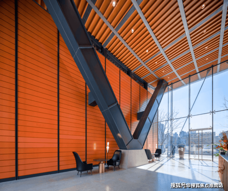 极具辨识度的红黄渐变外立面、270°转角无柱落地窗完美呈现,哪怕在春日不够耀眼的光线下,整个建筑仍折射出极有光泽的细节变幻。