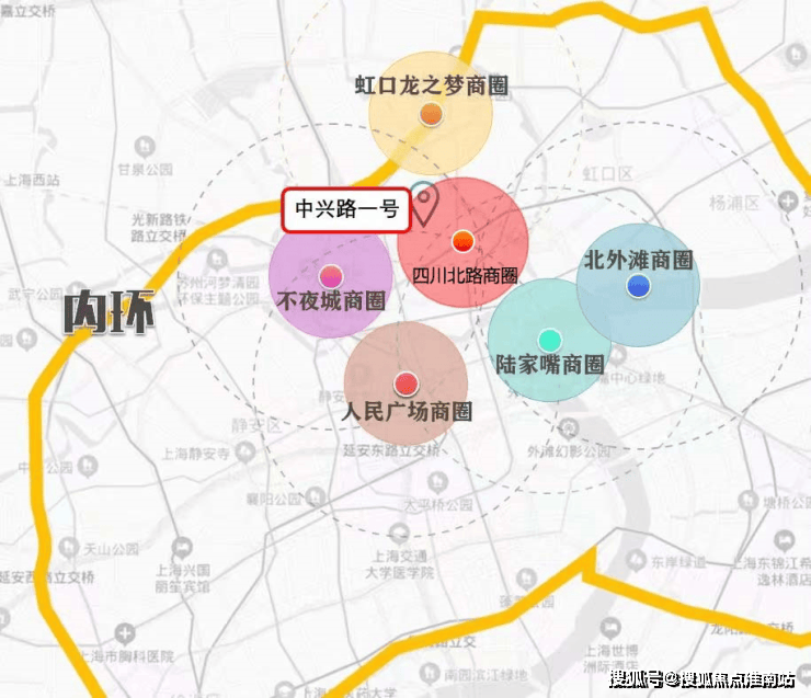 8号线中兴路、3/4号线宝山路站;北横通道、南北高架、内环高架环伺。