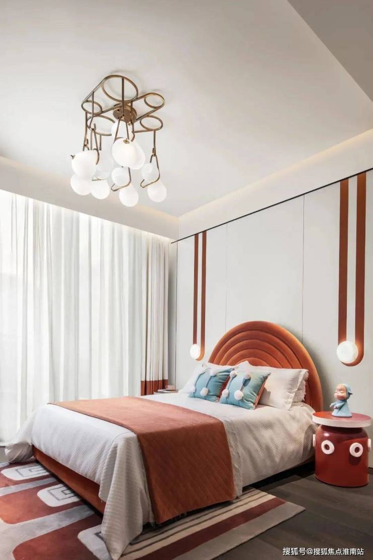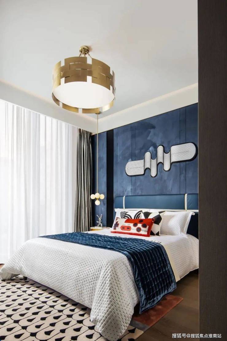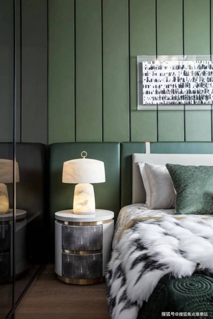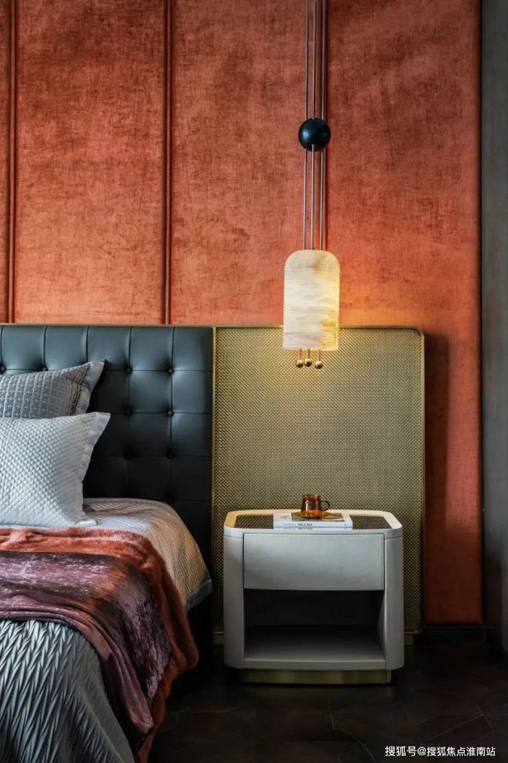 床头的背景墙设计巧妙而独特,皮料的柔软触感与金属的冷硬质感相互碰撞,形成了一种既现代又古典的美学风格,既展现了业主的非凡品味,又彰显出一种无法言喻的贵气。它们不仅提升了整个居住空间的品质感,更让业主在日常生活中能够感受到一种高品质的生活体验。