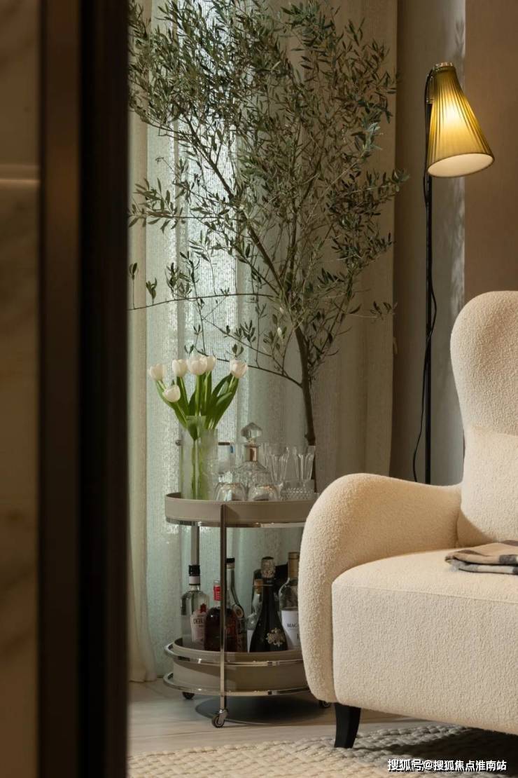 约9米净高的门廊尺度顶部挑高,南北向礼序轴与东西向精致生活轴交织形成十字转场,整个归家礼仪,在这里升华至顶点。