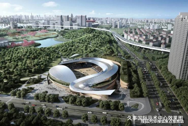 久事国际马术中心是国内首座符合国际顶级马术赛事标准的专业场馆。主体建筑包括竞赛场地、热身场、训练场和马厩等竞赛设施以及5000座的观众看台。山、水、谷的设计理念。目前已完成地上、地下结构、钢结构、升降灯架等重要工序。