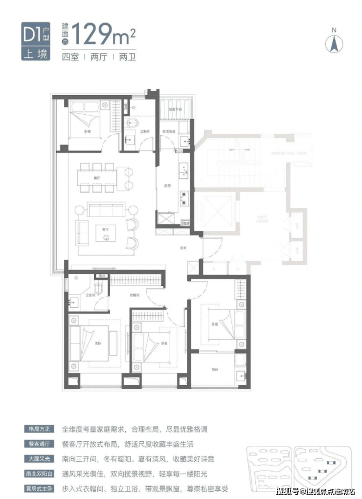 预算充足的小伙伴,可以选建面约129㎡4房,经典的三卧朝南、边套观景户型。