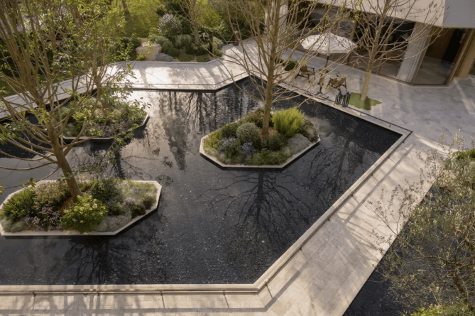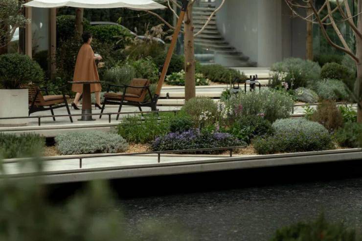 穿越核心水域,抵达光影水院的另一端,三座漂浮的花台映入眼帘。繁茂的花境簇拥着建筑盒子与邻水平台,构成花园主景。这里名为“弗珞拉”——取意自花神Flora,是一座临水而憩、充满惬意氛围的午茶花园。