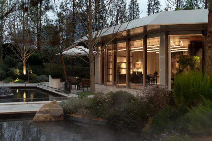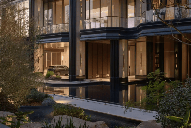 三层归家动线:从地面景观层到架空层,再到入户层,穿越绿植、光影与水景,步步进入私域。