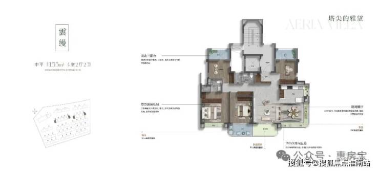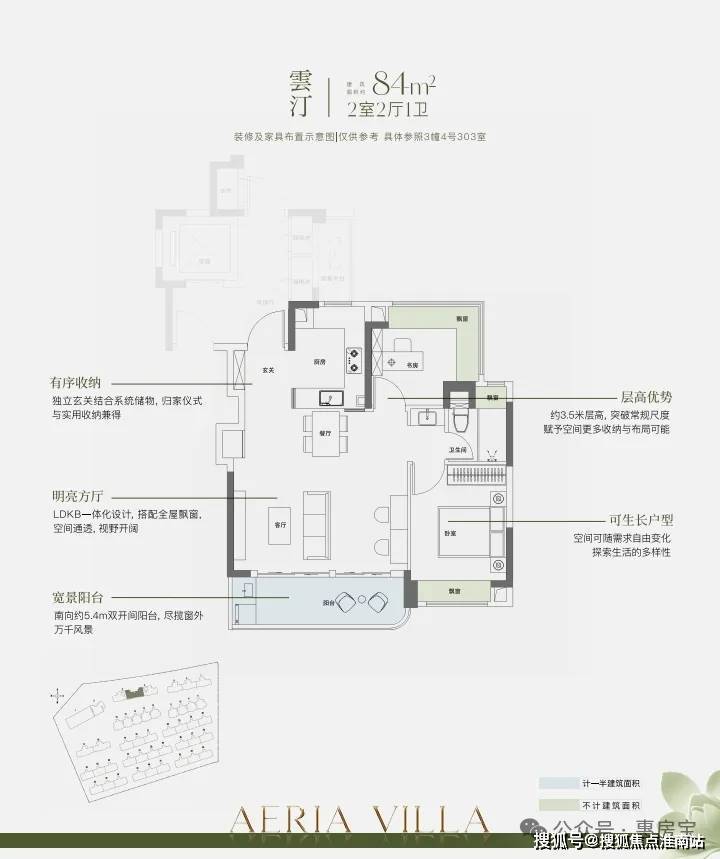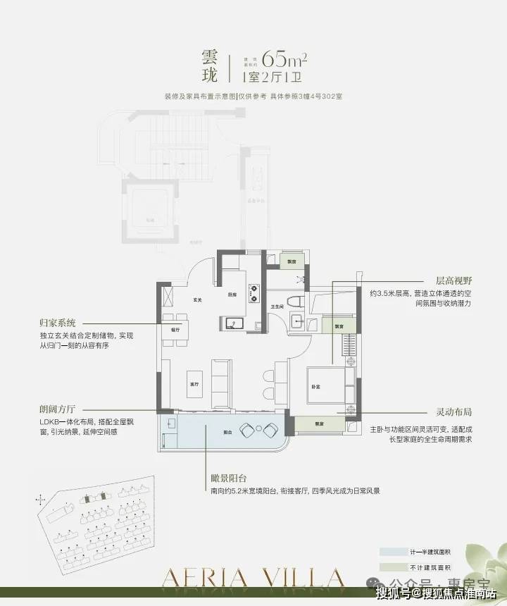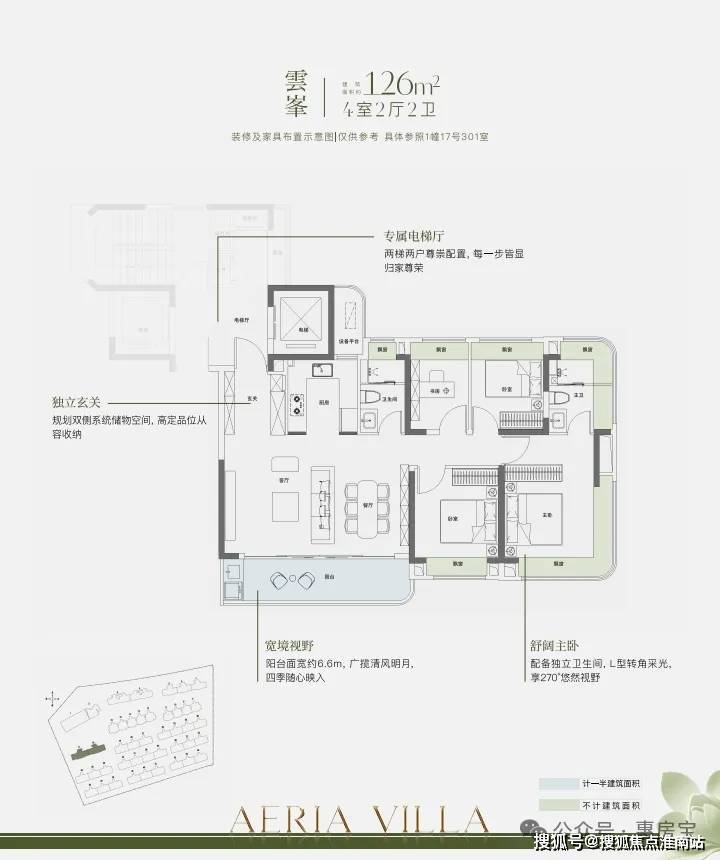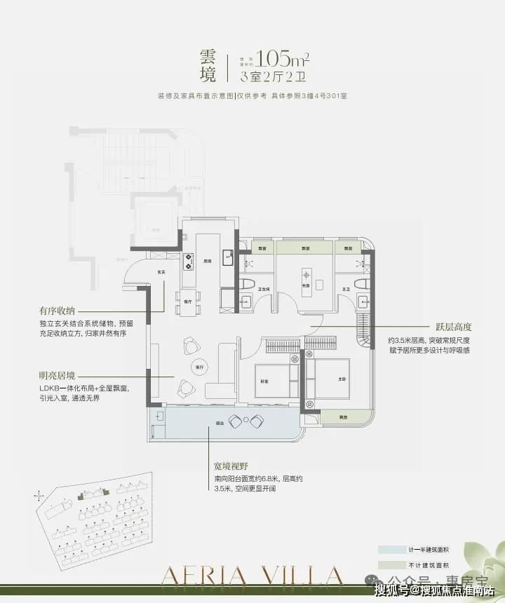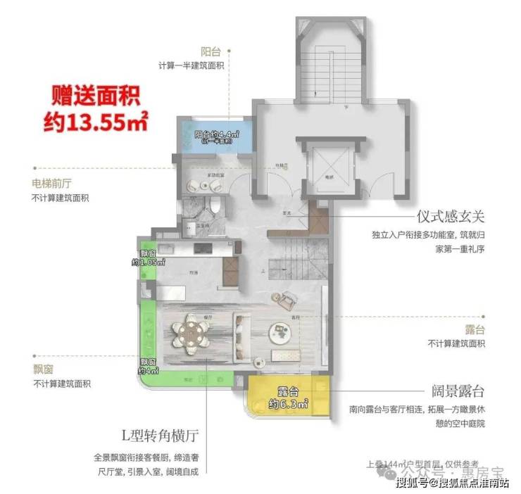 该户型附赠4个飘窗+3露台+1阳合½+挑空+闷顶等,实得率约135%!