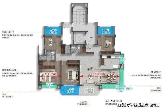 该户型附赠4个飘窗+3露台+1阳合½+挑空+闷顶等,实得率约135%!