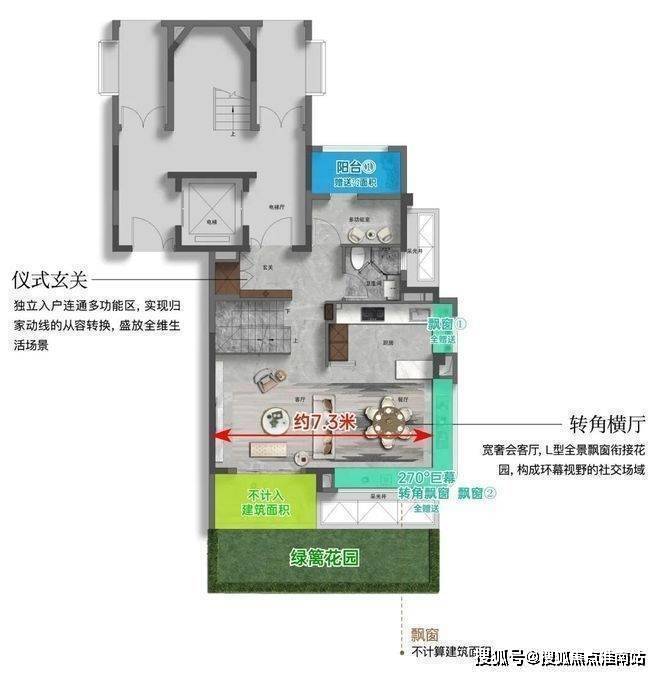 独立入户玄关,并设置大件收纳空间,南向约7.3米面宽客餐厅+附赠270°弧形巨幕转角飘窗;