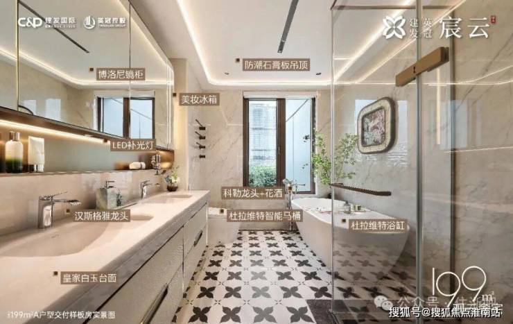 大金中央空调、菲斯曼地暖、霍尼韦尔新风、方太油烟机&燃气灶,博世蒸烤一体机&洗碗机&冰箱,杜拉维特盟洗盆&马桶&浴缸,汉斯格雅龙头&淋浴花洒,室内选用雪山兰、奥特曼灰、皇家白玉、太古黑金、普拉达绿、安第斯雪景等多种石材,更令人震惊的是,主卧还配置衣柜!