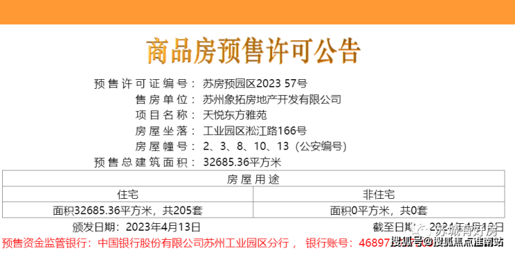开发商:苏州象拓房地产开发有限公司。天悦东方雅苑售楼处电话:400-9659-259项目备案名:天悦东方雅苑。预售证:苏房预园区202357号、苏房预园区2023105号