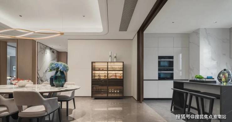 弧形元素缦云上海样板间里随处可见柔和的圆弧修饰,特别是柜体、墙体包边的圆弧转角,在进出各个空间时,减少磕碰的风险,对于有孩子和老人的家庭来说,是非常实用的友好设计。