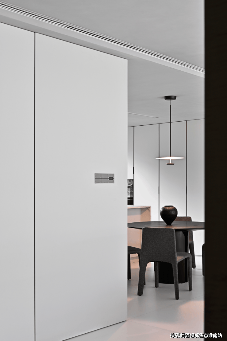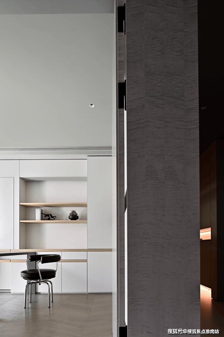 书房被藏在墙面的木色隐形门内,隐形门巧妙地在客厅与书房之间作了缓冲,避免白色“重叠”而造成疲劳感。