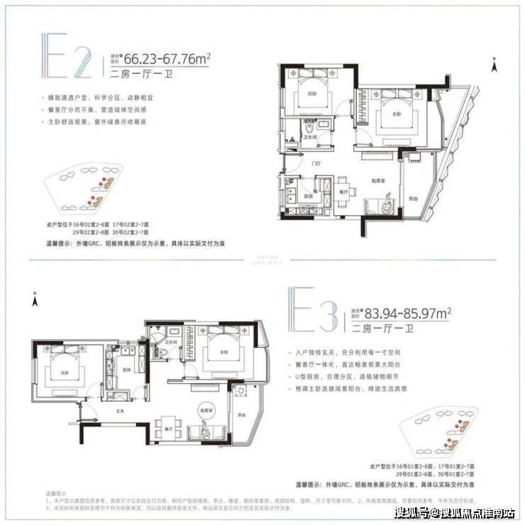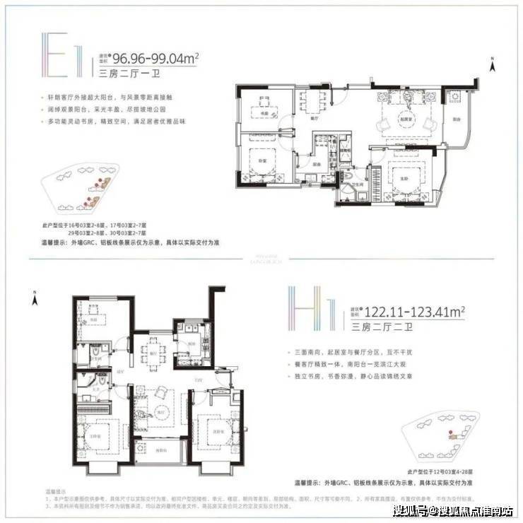 约109-116平方米为大两房,可满足对空间要求更高的家庭;约96-99平方米的三房两厅一卫,适合三口之家;