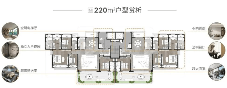 核心亮点:一梯一户、超大面宽、独立入户花园、超大南向空中庭院赠送。