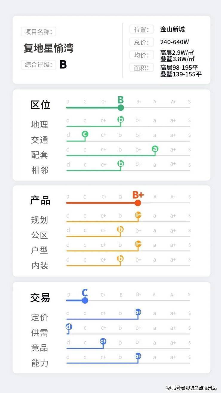 大家好,今天李想测评的就是位于金山新城的复地星愉湾。项目总建面约19万方,容积率1.8,由18栋中高层和21栋叠墅组成,总计1490套房源,其中高层建面98-195㎡,均价2.9万/㎡,叠墅建面139-155㎡,均价3.8万/㎡,总价在240-640万, 综合评级给到B。