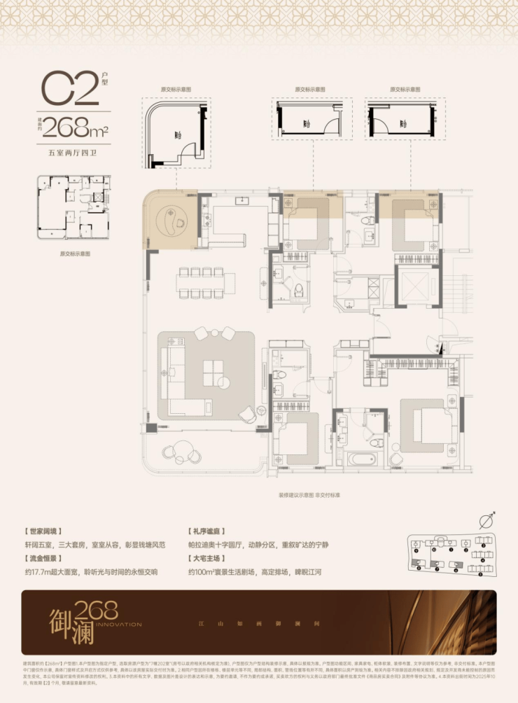面对如此卓越的天赋,天澜传序府也把最受市场欢迎的建面约265/268㎡放在了6号楼。其中建面约265㎡户型四开间朝南,整个面宽达到了惊人的约18.3m,而建面约268㎡户型更是配合豪宅仪式感,在入口处打造了帕拉第奥十字圆厅,客餐厅边上连着一个以弧形落地窗围合的X空间,从大五房设计,三套房规划,直至专属的独立家政空间,无论是建面约265㎡还是约268㎡都绝对是塔尖最顶级圈层的不二之选。