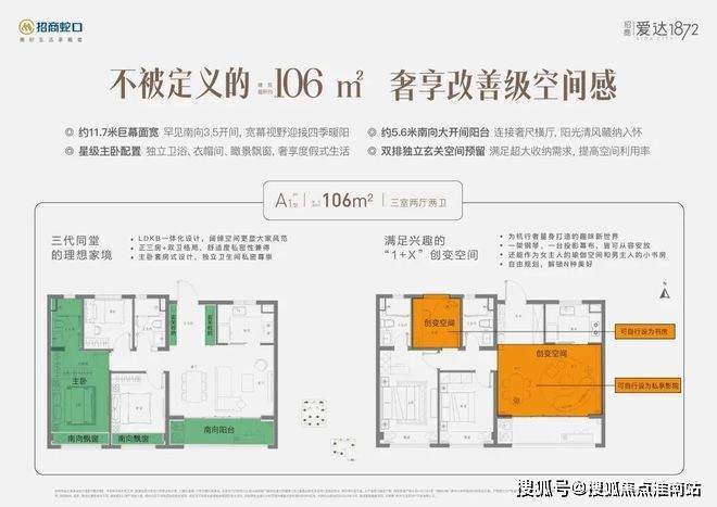 与常见的中间套户型不同,招商爱达1872的约106㎡,南向有3.5开间,面宽约有11.7米。如此一来,可以将更多南向开间面,留给餐客厅,同时外接约5.6米长的南阳台,让公区显得更为阔绰。