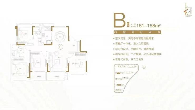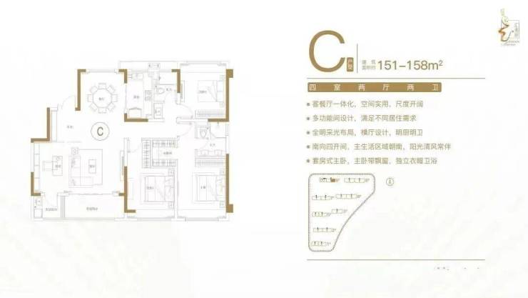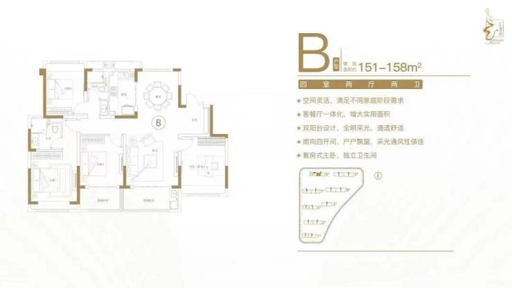 建面约151-158㎡四室两厅两卫户型特点:空间灵活,满足不同家庭阶段需求;客餐厅一体化,增大实用面积;双阳台设计,全明采光,通透舒适;南向四开间,户户飘窗,采光通风性俱佳;套房式主卧,独立卫生间。