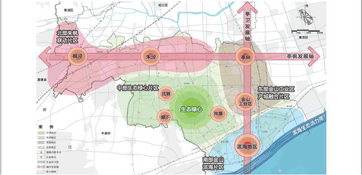 亭枫发展轴:依托亭枫高速、亭枫公路以及规划中的南枫公路串联枫泾镇、朱泾镇和亭林镇,发展成为贯通北部地区的东西向经济发展轴,以生活功能为主,同时聚焦古镇文化旅游、服务业和居住等功能。