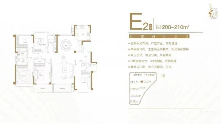 建面约208-210㎡五室两厅三卫户型特点:全明采光布局,户型方正,南北通透;南向四开间,主生活区域朝南,阳光清风常伴;双卫设计,客卫分离,从容美好;U型厨房设计,动线流畅,空间阔绰;套房式主卧,独立衣帽间、卫浴。