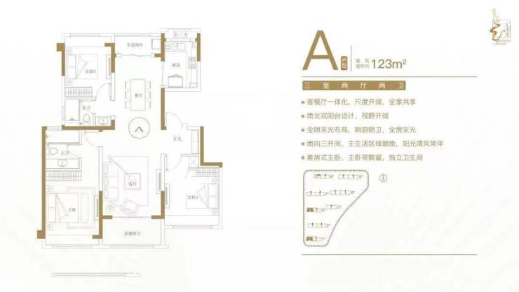 建面约123㎡三室两厅两卫户型特点:客餐厅一体化,尺度开阔,全家共享;南北双阳台设计,视野开阔;全明采光布局,明厨明卫,全房采光;南向三开间,主生活区域朝南,阳光清风常伴;套房式主卧,主卧带飘窗,独立卫生间。