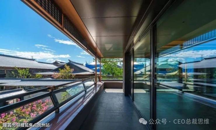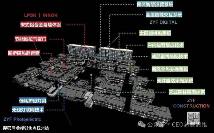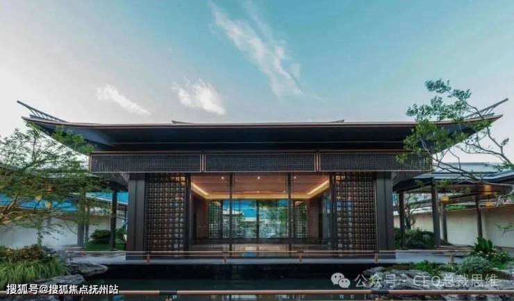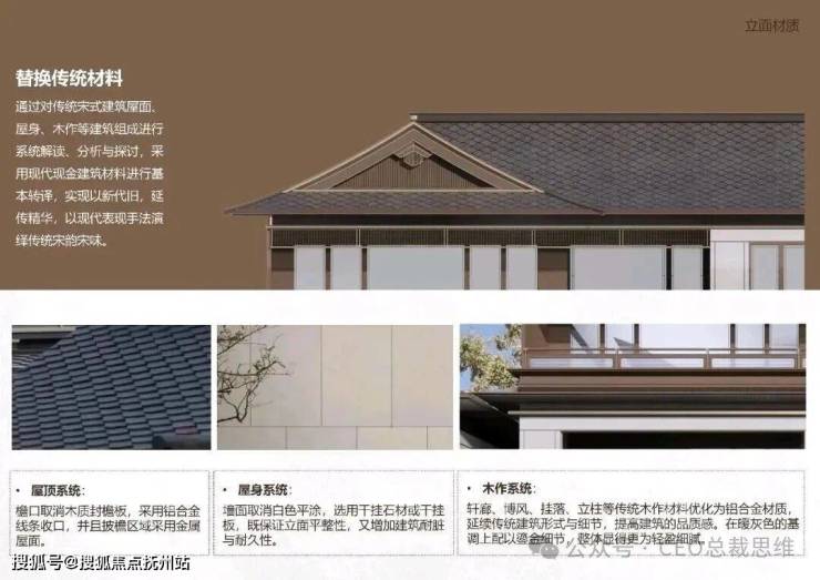 低层合院层高3.2m,南北通透,通过采光天井、全景落地窗优化自然采光与通风;立面采用浅灰色石材干挂+深褐色铝板干挂,屋顶采用装饰格栅+屋脊装饰构件等,中式风格。