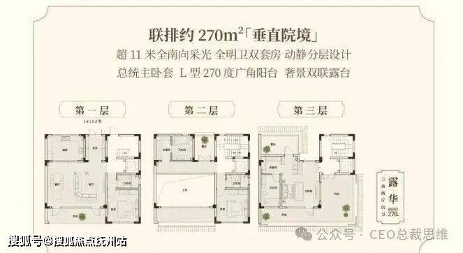 建面约270-310m²联排,超11米全南向采光、全明卫双套房、动静分层,总统主卧套房,奢景双联阳台/露台,L型270°广角阳台,舒适远超一般改善;