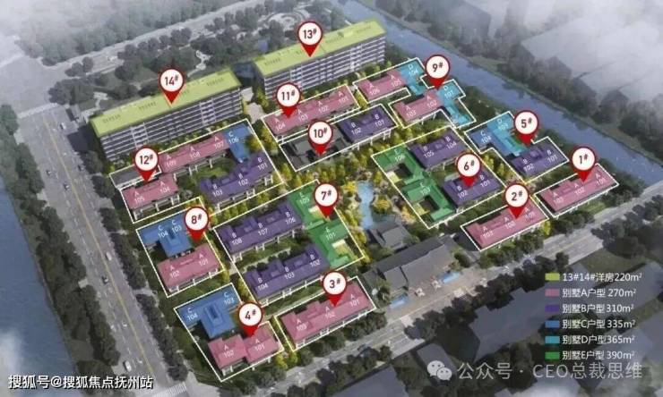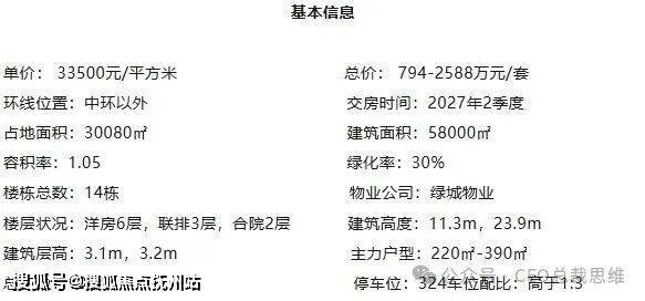 共14幢105户,合院联排12幢57套,洋房产品2幢48套,其中联排总高3层有270平(26套),310平(17套),合院335平(6套),365平(3套),390平(4套)最后一排是两幢总高7层(一楼架空)的洋房共48套。